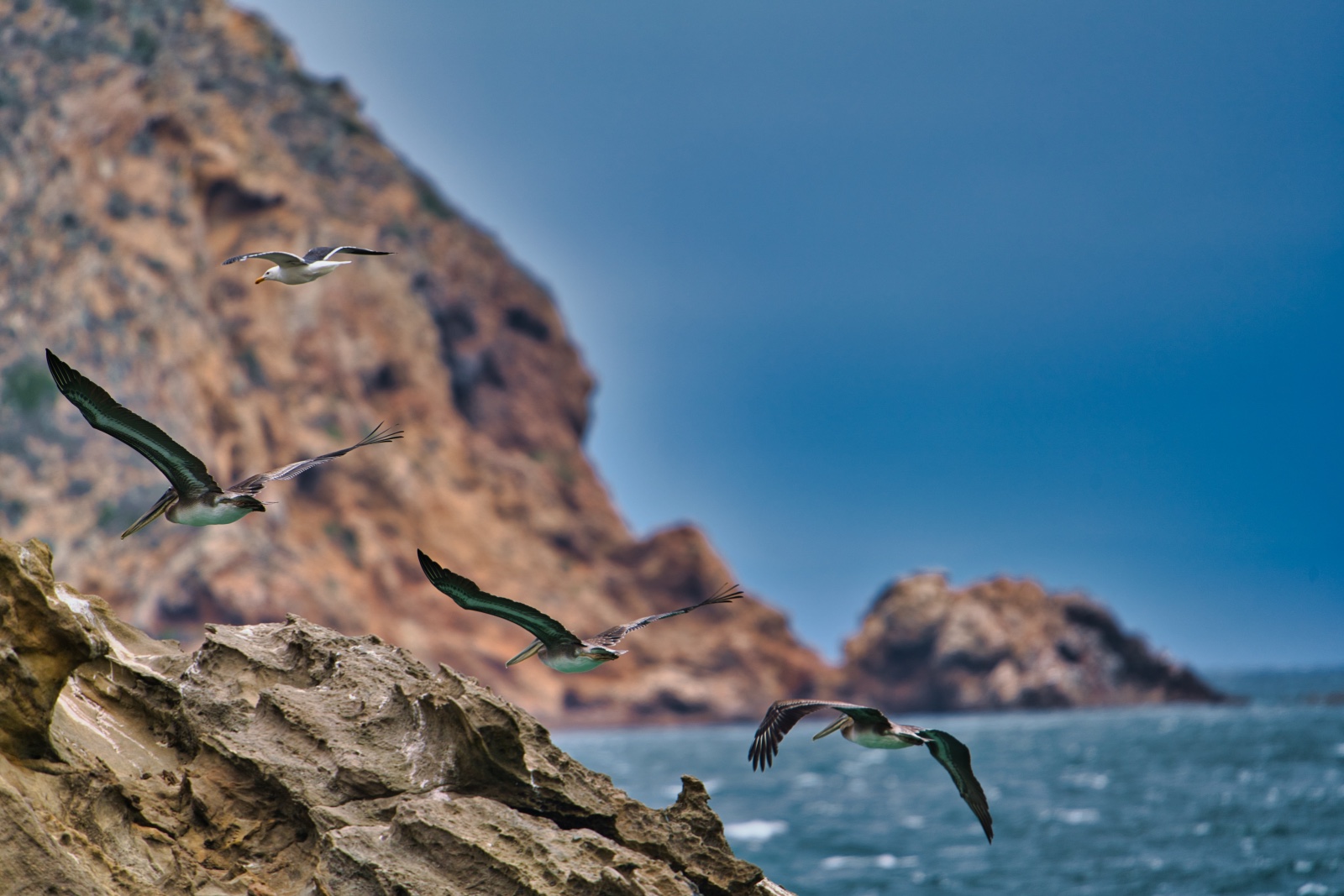 Low flying Storks off Cuyler Harbor, San Miguel ISland